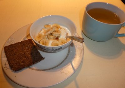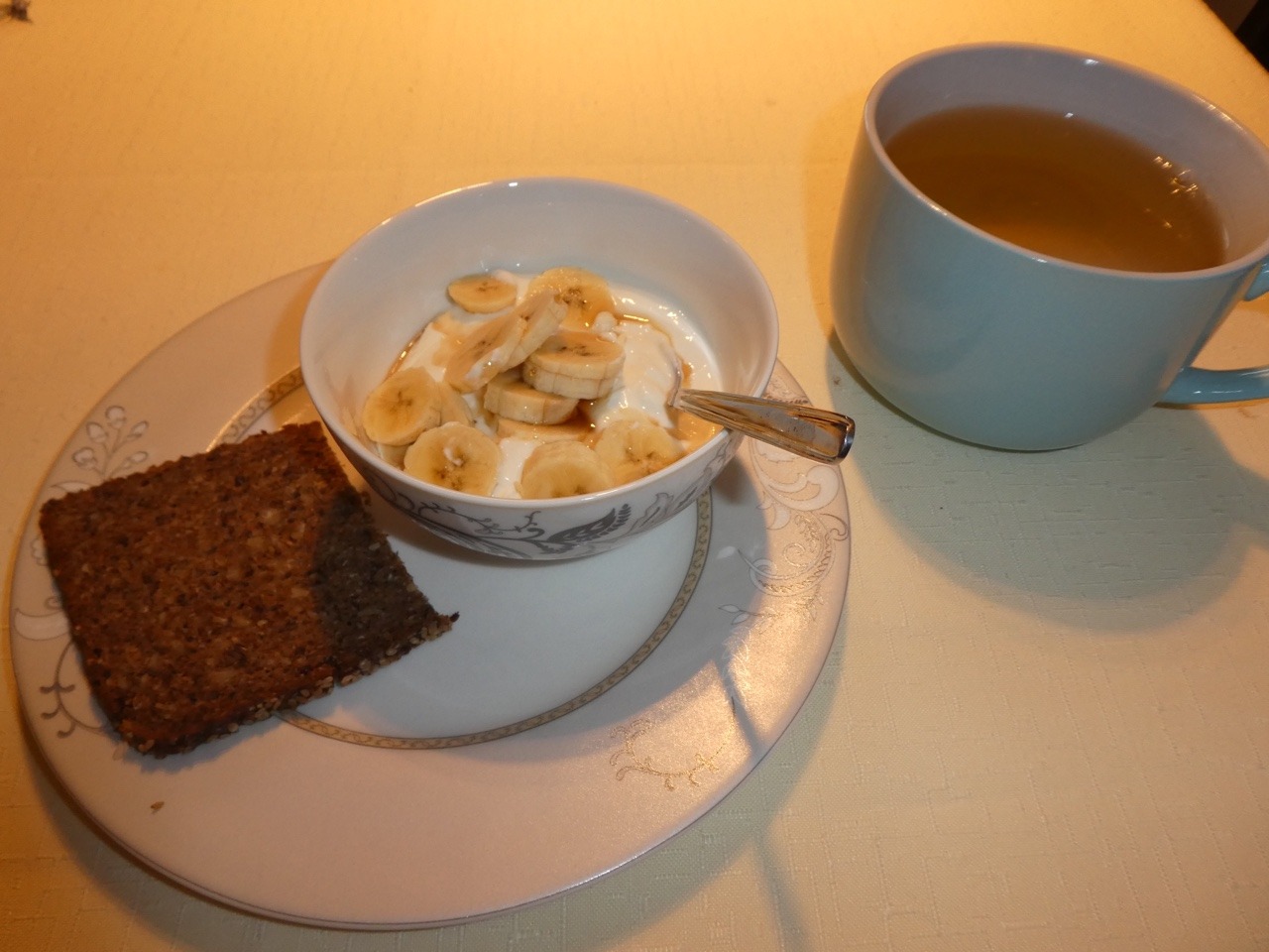 7. Tag: Als Frühstück Yoghurt mit Banane und Ahornsirup, Vollkornbrot und Grüner Tee.