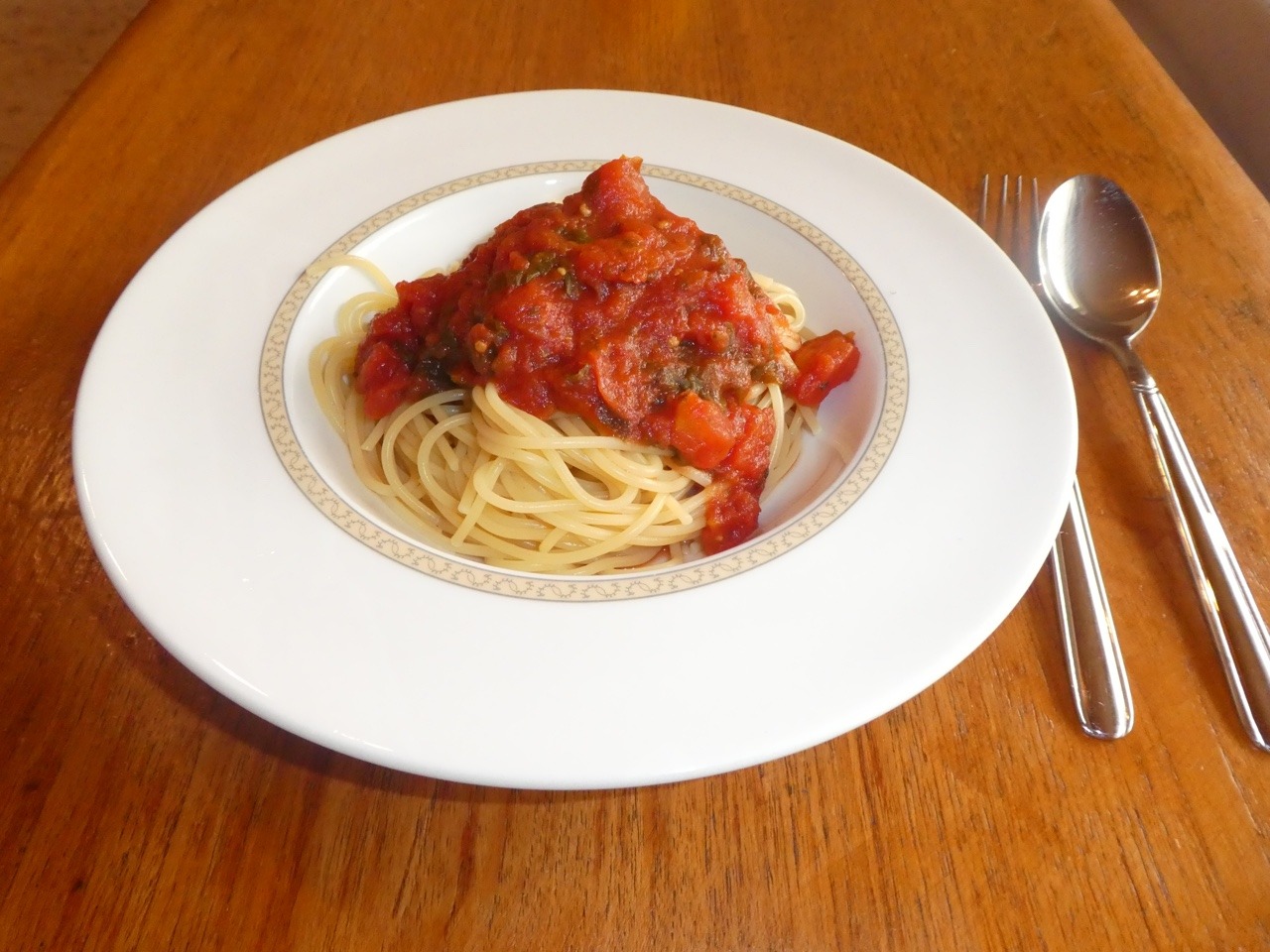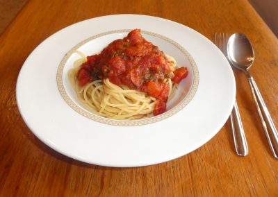 Mittagessen: wer mag Spaghetti mit Tomatensauce nicht? Alles sehr lecker. Gestern saß eine Hose schon lockerer, die vorher eng war, sehr erfreulich. Körperliches und seelisches Wohlbefinden ist sehr gut.